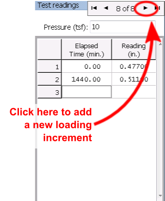 When you're finished entering data for the increment, to start a new increment click on the "Next loading increment" button (see the figure below) or press Enter in the test readings grid without entering anything in the current row's elapsed time column.