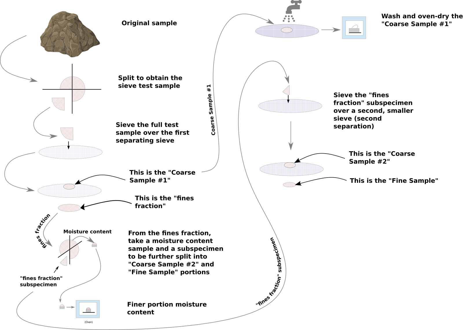 - If the sample is not dried, a moisture content test on the material passing the first separation sieve is required. (This is the "Fines fraction" moisture content called out in the figure above.