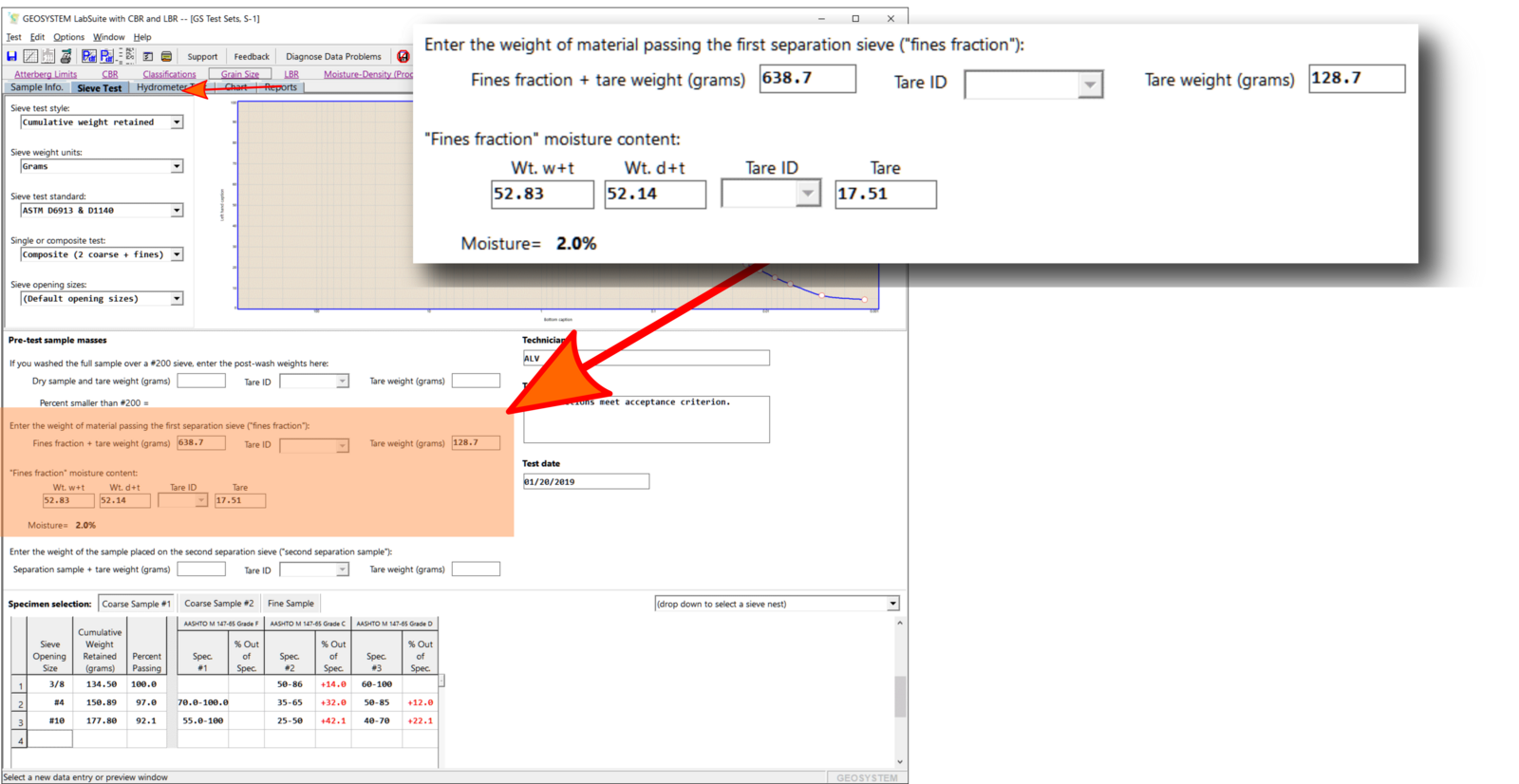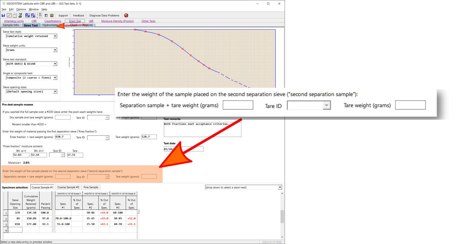 - If your test included a second separation step (giving you two coarse samples and one fine sample), the program will of course need the mass of the sample passing the second separation sieve. This mass is entered in the highlighted box shown in the following figure: