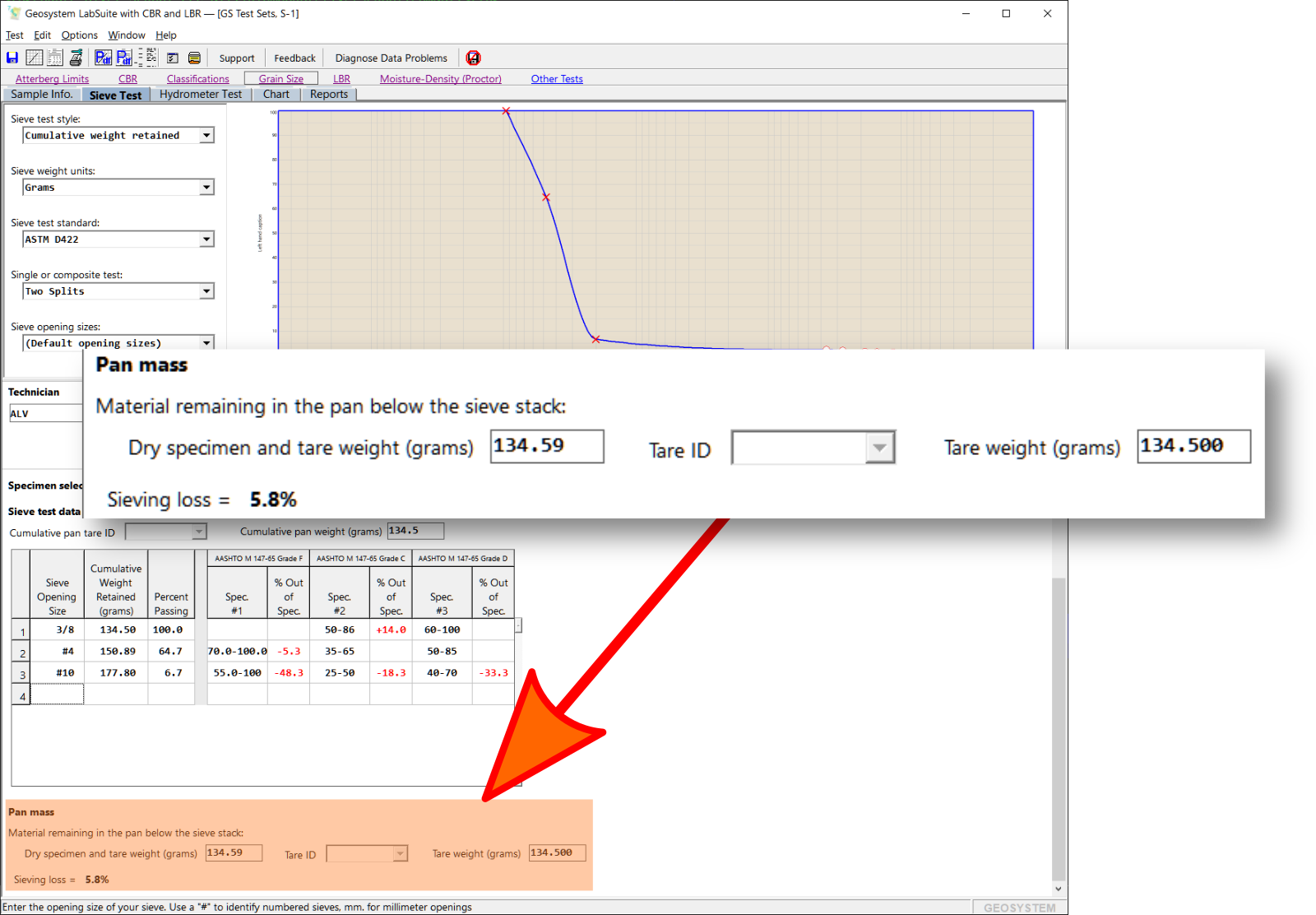 After you've entered a sieve stack, you can optionally enter the mass passing the smallest sieve in the stack (as captured by a pan below the stack). If you enter this value, LabSuite can calculate: