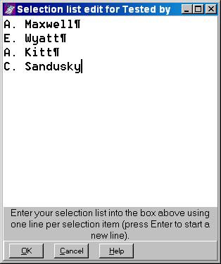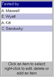 - You can set up a list of standard entries for fields such as "Tested By", "Checked By", etc. so that you can select -- with a single mouse click -- from a list of personnel instead of typing in the same names over and over for every test you enter.