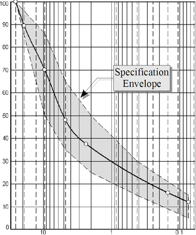 Specification envelopes provide upper and lower percentage boundaries for various particle sizes. For example, your client may specify that a given delivered material consist 100% of particles smaller than 3/8", and contain a total of 10% to 20% particles smaller than the #200 sieve.