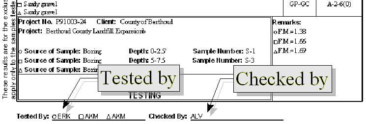 LabSuite normally uses the material description that you entered into the Material Description field on the Data Manager window (that's the window with the numbered sample cards where you entered the sample's number, depth, etc.). However, if you're entering boring log data, the material description at the depth where you took your lab. test sample may only be something like:grades to slightly silty