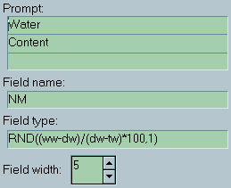 This capability may be used for other calculations (density, for example): make up names for each of the values involved in the calculation (e.g.,WW,DWandTWin the example) and enter the resulting equation into the Field type section of the data entry field designated to show the calculation result ("Water content" in our example"). - After entering the equation, select "Entry Form" > "Exit".