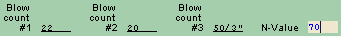 If an N-value calculation is added to the LOGDRAFT data entry screen, the data entry person has the chance to override the program's calculation: after the 2nd and 3rd blow count values have been entered, LOGDRAFT will calculate an N-value and automatically enter it into the N-value data entry field, as shown below. However, N-value is simply another data entry field: the data entry person can change the 70 to whatever is desired.