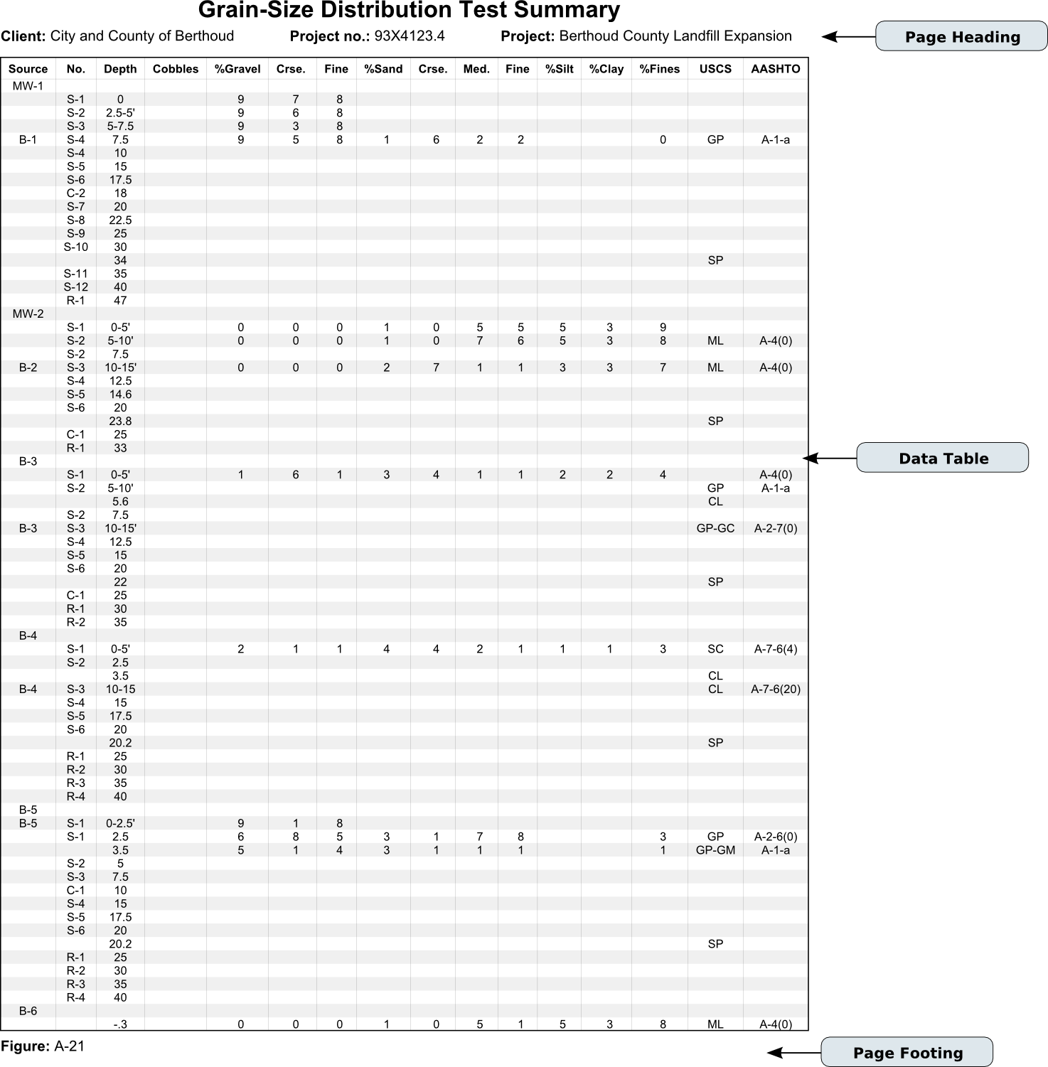 A printed list is a report that is sent to the printer which uses the information specified in a configuration file and the data stored in a given project file. Printed lists consist of a page title, a heading section, which lists data common to the entire project such as the project name and the client's name, the table section, which lists selected sampling and testing data, and an optional footing section, which just includes a figure number chosen by the user.