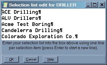 Each selection that you want to appear is typed on a separate line: Type a selection, then follow by pressing the Enter key (this will show up as a ¶ sign at the end of the entry). (You can delete entries by simply deleting the line of text that defines the entry, including the ¶ sign at the end of the line.) When you're finished, click OK to save the list.