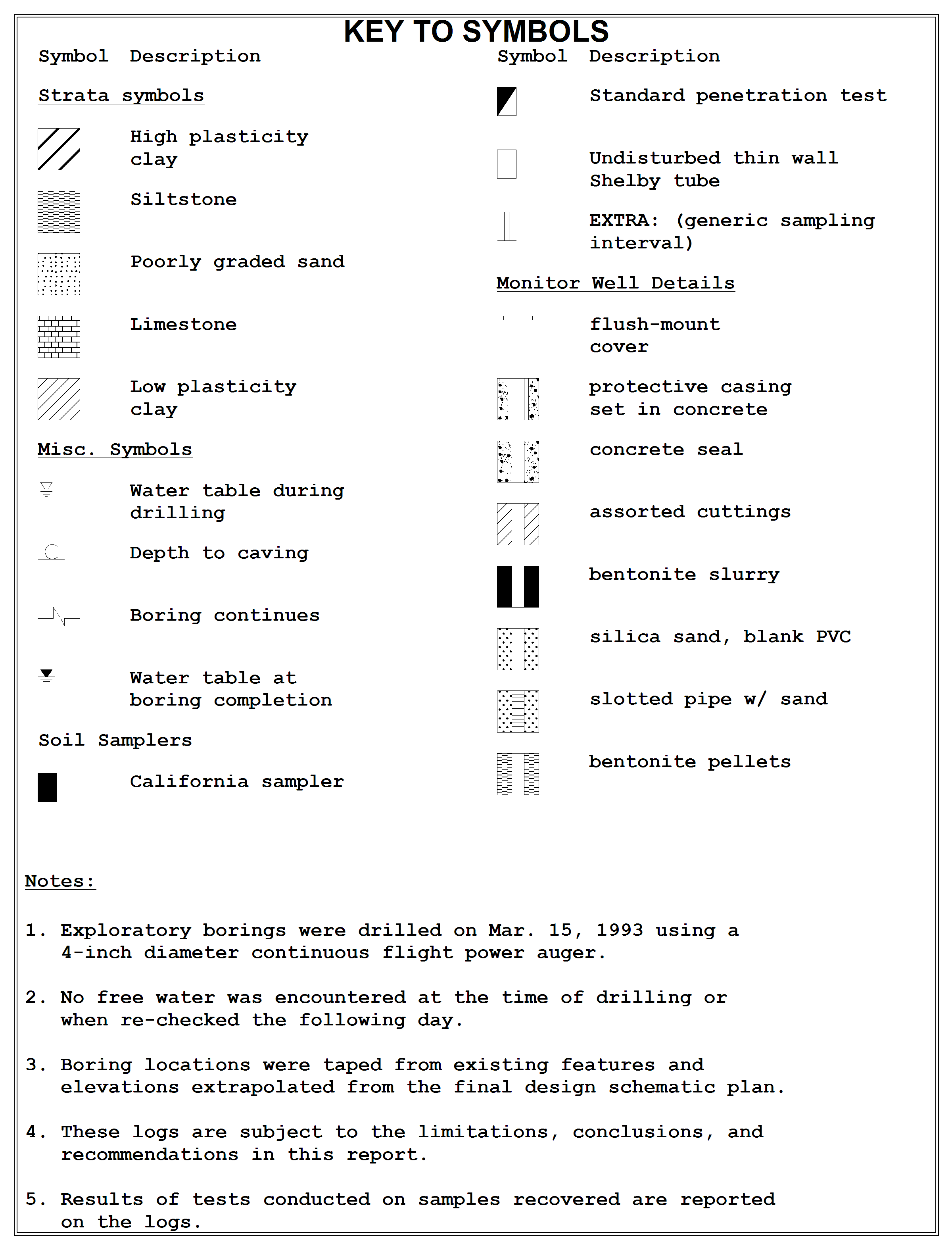 As part of a boring log or profile report LOGDRAFT can produce a legend listing descriptions for each of the stratigraphy patterns and sampler symbols used on the log. Some reports, like the profile sample shown in this figure, include the legend on the same page as the subsurface data. Alternatively, LOGDRAFT can add one or more separate pages of legend to your standard boring log reports by using a special form designed just for printing legends (like the one shown in this figure). These legends are automatically printed after your regular boring logs or profiles are generated.