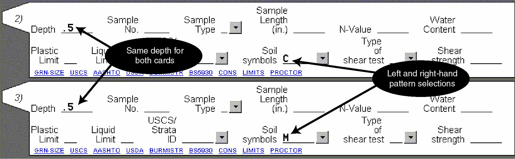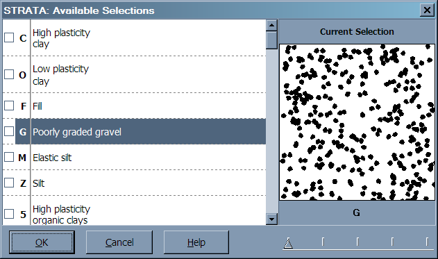 Many data entry forms include a USCS classification column: if you enter a classification, LOGDRAFT will automatically choose strata patterns appropriate for your soil's classification. (LOGDRAFT chooses the patterns from the legend file associated with the project -- this page discusses these files in detail.) You can override LOGDRAFT's automatic choice of patterns by just typing in your new choice; however, if you go back and enter a new USCS classification, LOGDRAFT will override your choice with the patterns appropriate to the new classification.