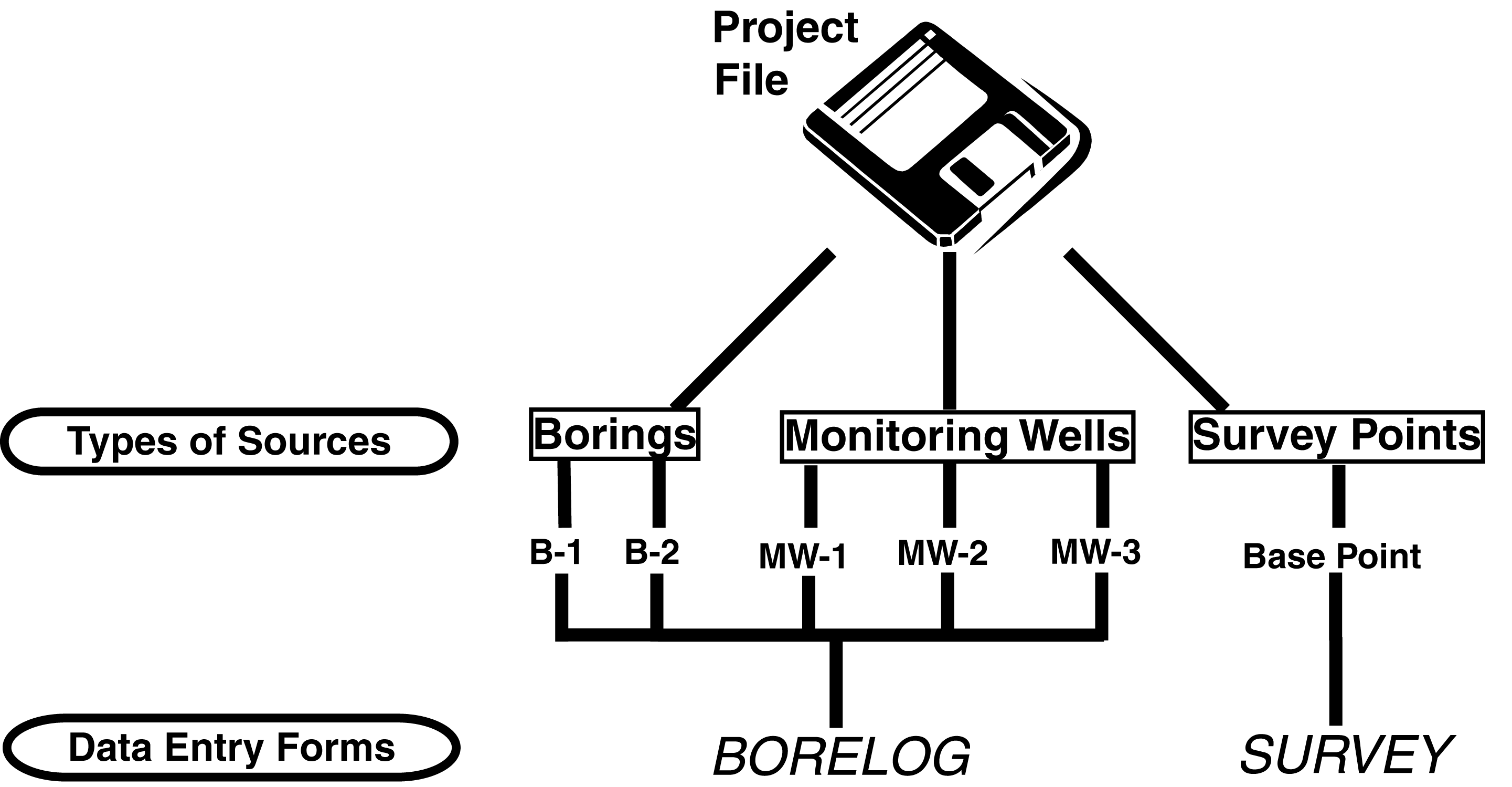 When you're entering your data, LOGDRAFT looks to a file called a data entry form to determine the prompts and data entry fields you should be presented with. Each project file has at least one data entry form that is automatically associated with it: When you begin entering data into a project, LOGDRAFT looks to see what data entry form has been associated with the project, then shows the data entry prompts defined by that data entry form. Projects can use multiple data entry forms so you can, for example, have a data entry form for entering monitoring well data, another for entering borehole data and a third for entering the coordinates of a survey point. For example, the following project uses two data entry forms: one called "BORELOG" that's used with the borings and monitoring wells stored in the project, and a second called "SURVEY" that's used to enter the data for "Base Point".